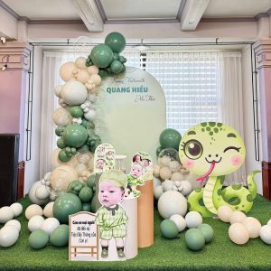 Với thiết kế chủ đề rắn con dễ thương trong hình ảnh bạn gửi, bữa tiệc đầy tháng của bé trai trở nên sinh động, tươi mới, mang đậm dấu ấn riêng.